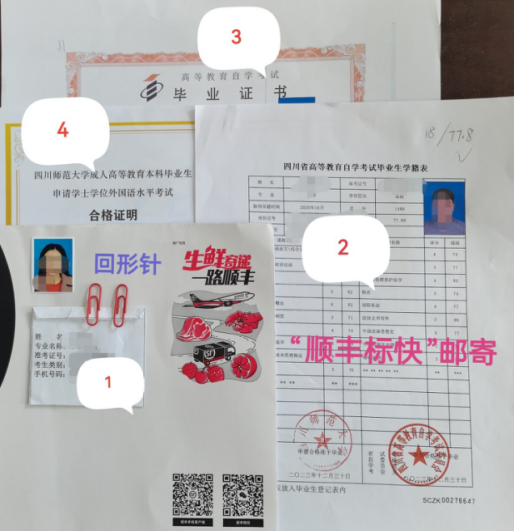 一.纸质材料整理要求1.学籍表右上角空白处用铅笔标注“科目数/平均分”。2.照片统一放入照片收纳袋中。3.纸质材料按从上往下顺序:(1)收纳袋(内含三张2寸蓝底照片,每张照片背后写上“姓名 准考证号”)(2)学籍表(右上角空白处用铅笔标注“科目数/平均分”)(3)毕业证(4)外语证材料整理完毕,并用回形