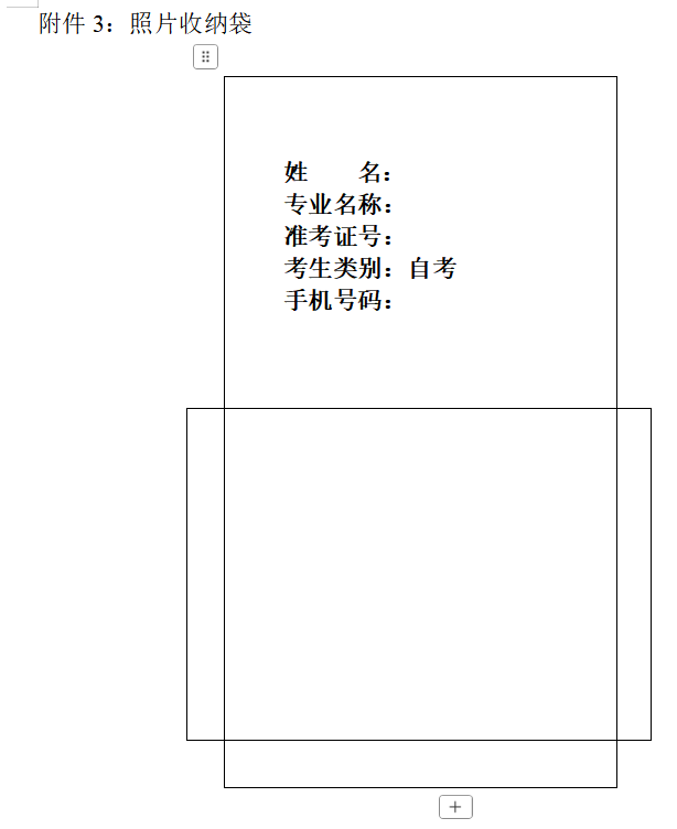 注:1.本页须打印裁剪,然后折叠左右两边并用胶水粘贴;2. 空格信息必须填写完整;3. 先将内容按表内示例的格式填写后再打印制作;4. 考生类别统一填写“自考”。5. 制作方法。(1)将收纳袋图样裁剪如下;(2)将粘接边内折;(3)在粘接边上粘贴;(4)粘接后成完整的照片收纳袋;(