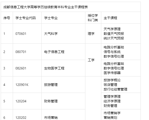 成都信息工程大学高等学历继续教育本科专业主干课程表序号学士专业代码学士专业授位学科门类主干课程1070601大气科学理学天气学原理数值天气预报统计天气预报2080701电子信息工程工学电路分析基础信号与系统数字信号处理3082601生物医学工程电路分析基础数字信号处理医学传感器4120901K旅游管理管理学旅游学概论饭店管理旅行